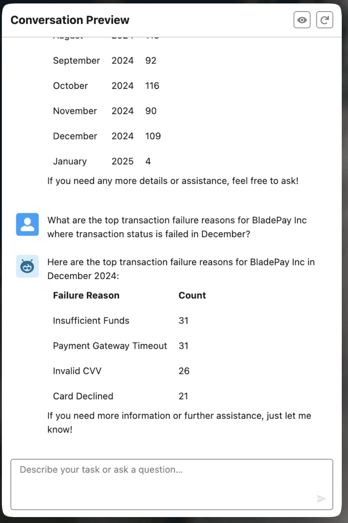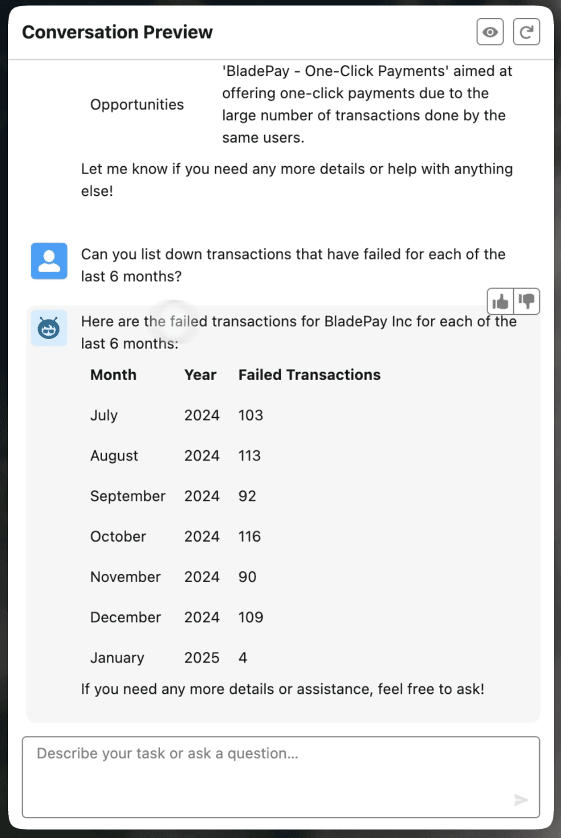 Instead of clicking through dashboards and digging into reports, the account manager can prompt the agent to drill down further. And in seconds, the agent pulls up a breakdown of failed transactions over the past few months, making it easy to spot trends.