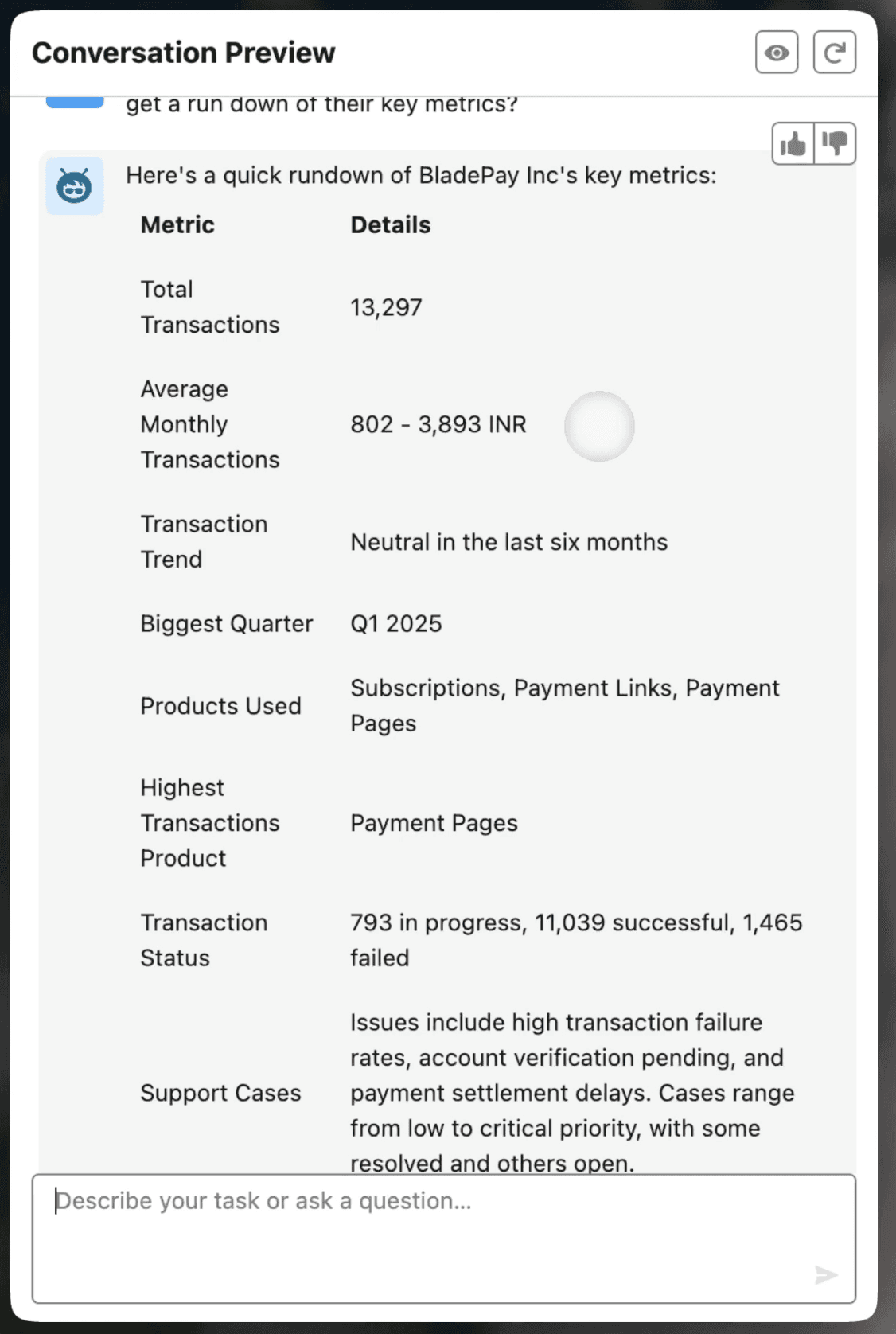 Picture an account manager at a payments company juggling 50+ small and medium merchants, each using multiple products. Before a merchant meeting, they have hardly 5 minutes to prepare their key talking points. They need a quick business pulse check — transaction trends, support issues, and growth opportunities.