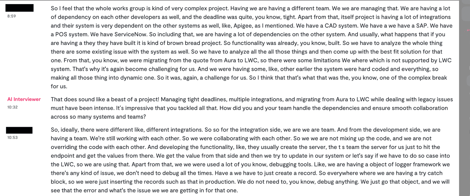 The candidate talked about working with complex integrations and migrating from Aura to LWC — and the AI Interviewer responded with a relevant, thoughtful follow-up. That’s not just automation — that’s real interviewing.