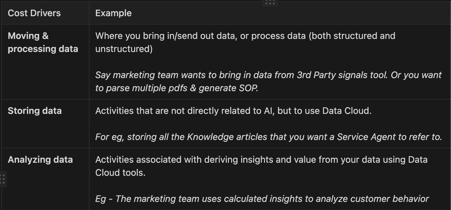 Most impactful agents will almost always refer to such data, and often in large quantities. Such data processing consumes Data Service Credits. You can broadly group them into 3 cost drivers: